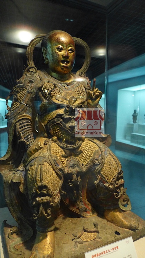 真武即玄武,古代神话中,北方玄武与东方青龙、南方朱雀、西方白虎同为四方之神。因北方七宿(斗、牛、女、虚、危、室、壁)组成龟形,其下有腾蛇星,故谓龟蛇合体;位于北方,属水,其色玄,敬称玄武。道经言:玄武生于黄帝时,为净乐国太子,入湖北太和山修炼,久而得道,被玉帝册封为「玄武真君」。宋真宗时,改玄武为真武。天禧二年(1018)加封真武为「镇天真武灵应佑圣帝君」,简称「真武帝君」。由宋至明,历代皇帝对真武屡加封赠。自道教把真武奉为人格化的神以来,武当山道教把它尊为最高尊神,沿袭至今。现存于武当山文物管理所的一尊真武像,铸于十二世纪初,铜制,像作披发,赤足履龟蛇。南宋赵彦卫《云麓漫钞》也说真武“披发、黑衣、仗剑、踏龟蛇”。